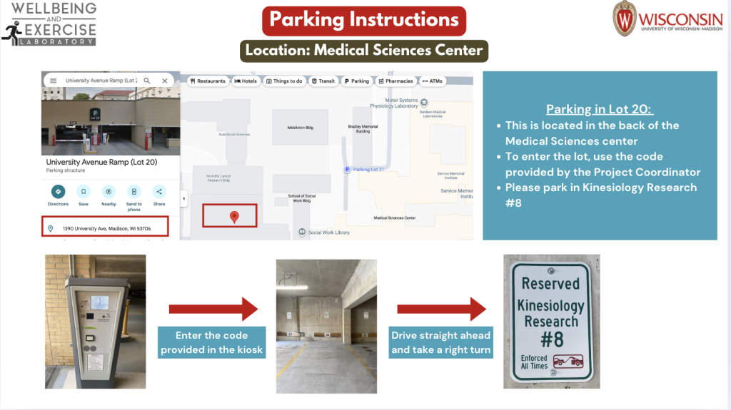 - Lot 20 (3 minute walk): If you choose this option, you will be given a code to enter the parking lot and leave the parking lot. Once entering the parking lot, you will park in Kinesiology Research Spot #8