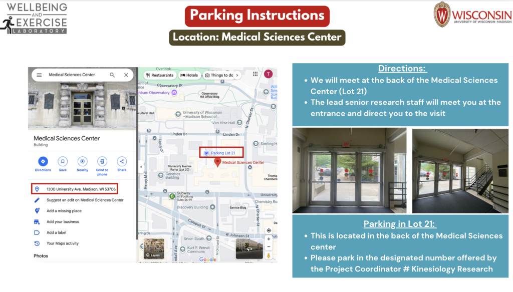 - Lot 21 (1 minute walk): located at 1221 Linden Drive. If you choose this option, you can park in Kinesiology Research Spot #3. The project coordinator will let you know if you need to park somewhere else.
